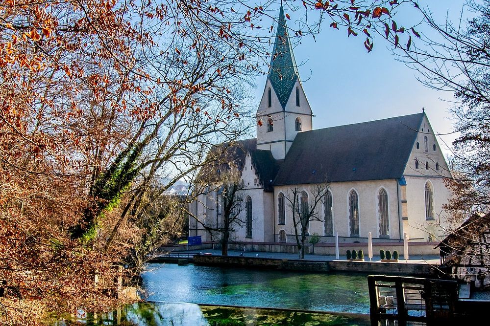 Vue du Blautopf sur l'église du monastère de Blaubeuren a été photographiée et traitée par Photoart-Naegele 2022.