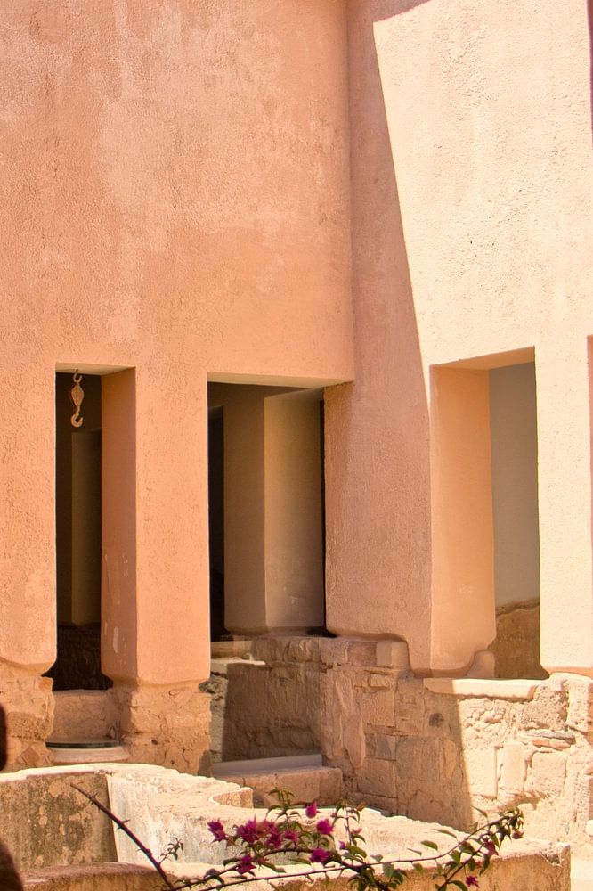 Il s'agit d'une belle vue montrant un magnifique bâtiment historique grec avec un ciel bleu en arrière-plan. Les fleurs roses en font une scène estivale.
