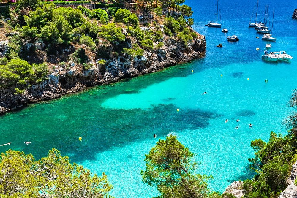 Vue idyllique de la baie avec des bateaux yachts à Majorque, Cala Pi, magnifique bord de mer, Espagne mer Méditerranée, Majorque, îles Baléares, mer Baléares, mer Méditerranée, Espagne