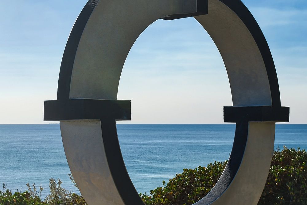 Vue latérale de l'œuvre d'art Centrefold près de la banlieue de Cottesloe, qui fait partie de la ville de Perth, en Australie occidentale. Il y a de nombreuses œuvres d'art dans les environs de Perth qui sont littéralement omniprésentes, mais nous avons particulièrement aimé celle-ci.