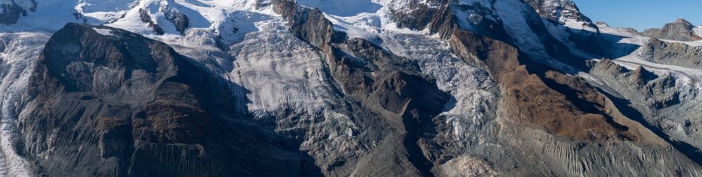 Vue panoramique depuis le Gornergrat près de Zermatt en direction du sud et de l'ouest, sur le Cervin, le massif du Mont Rose avec la Pointe Dufour ainsi que Liskamm, Castor, Pollux, Breithorn et Petit Cervin et le système du glacier du Gorner dans le canton du Valais, Suisse.