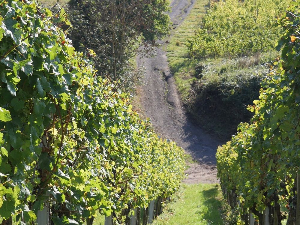 Un regard sur les vignes au Luxembourg, avec des collines ondulantes et des vues de grappes de raisin proches de la maturité en automne.