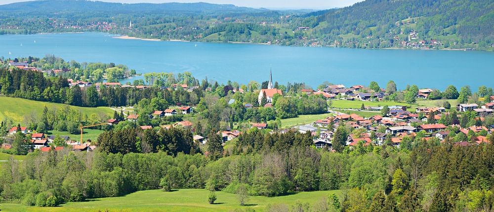Vue sur Bad Wiessee et Tegernsee depuis le Bucherhang, paysage de printemps en Bavière