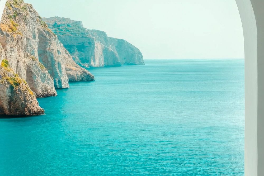 Un doux rayon de lumière inonde une élégante arche qui offre une vue époustouflante sur les eaux scintillantes d'un bleu azur. Des falaises majestueuses encadrent l'horizon, tandis que l'ambiance paisible du paysage donne un sentiment de liberté et d'espace. L'harmonie entre l'architecture et la nature crée une retraite paisible qui invite à la rêverie.