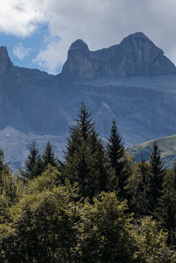 De l'herbe, des arbres, des montagnes et un ciel bleu. Une vue magnifique sur les montagnes à Silbertal, dans les Alpes autrichiennes.