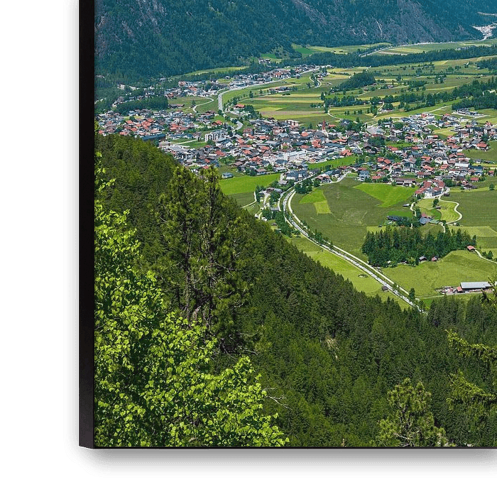 Vue sur l'Ötztal et la ville d'Umhausen au Tyrol, en Autriche, lors d'une belle journée de printemps dans les Alpes.