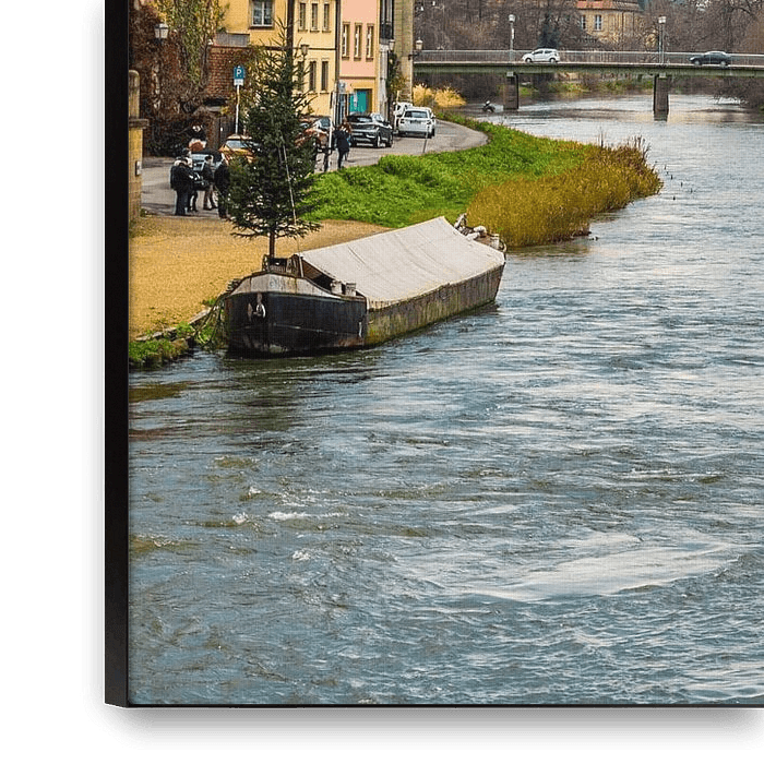 L'œuvre d'art montre une vue authentique de la vieille ville de Bamberg. Au centre se trouve la rivière, qui traverse tranquillement le paysage urbain. Le long de la rive s'alignent des maisons historiques à colombages aux toits rouges, dont l'architecture marque le caractère de la ville. Deux bateaux - dont un de plaisance - animent…