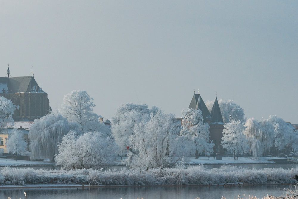 Vue sur Kampen et la rivière IJssel en hiver en Hollande. Kampen est une ancienne ligue hanséatique située à Overijssel, aux Pays-Bas. La Bovenkerk est visible au premier plan de la ville.