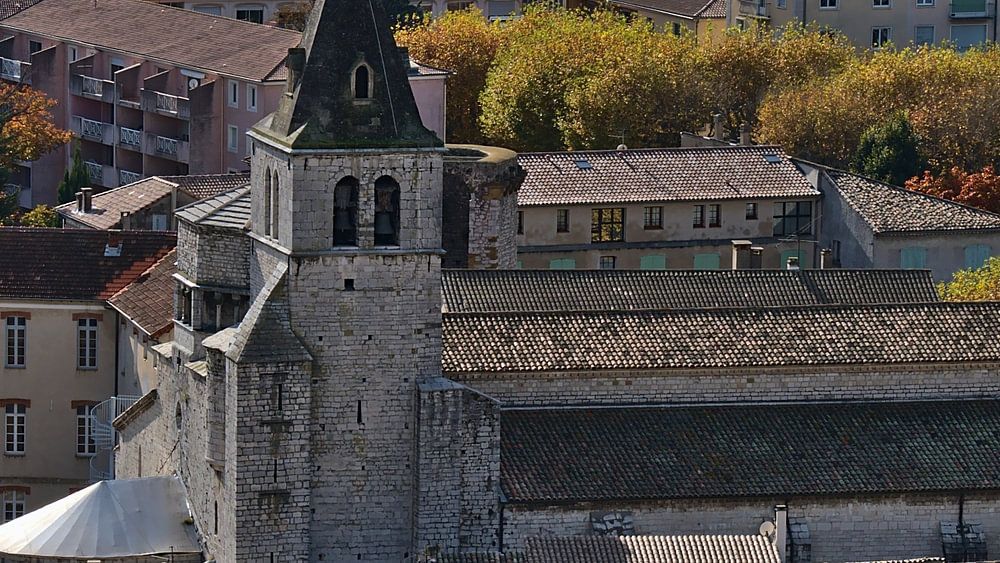 Photo du centre historique de Sisteron, également appelée la porte de la Provence, dans le sud de la France, avec l'église Notre-Dame-des Pommiers (romantisme) entourée de vieux bâtiments en automne avec des feuillages décolorés.