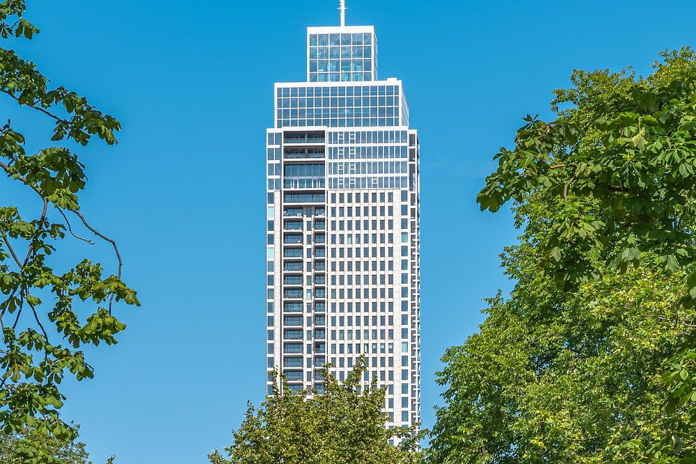 Le contraste entre la beauté naturelle du parc et le design moderne et élégant de la Tour Zalmhaven met en valeur le mélange de charme historique et d'innovation moderne de Rotterdam. La façade en verre de la tour reflète la verdure environnante et ajoute un élément dynamique à la vue.