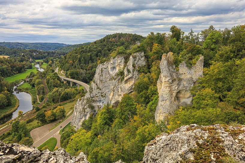 Vue sur les ruines du château fort à aiguilles rocheuses de Gebrochen Gutenstein et sur le Danube dans le parc naturel du Haut-Danube par BlattArt - Christine Horn
