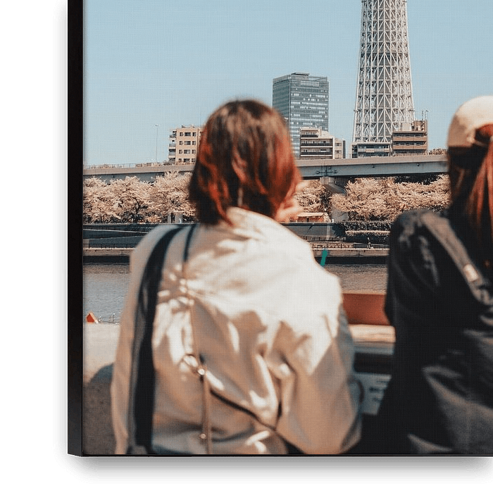Cette image associe l'architecture moderne, la vie urbaine et l'idylle des cerisiers en fleurs. Deux personnes regardent l'imposante Tokyo Skytree, la plus haute tour du Japon, qui marque la ligne d'horizon. Au premier plan, des sakura fleurissent le long de la rivière et offrent au scénario un cadre naturel et ludique. Le scénario…