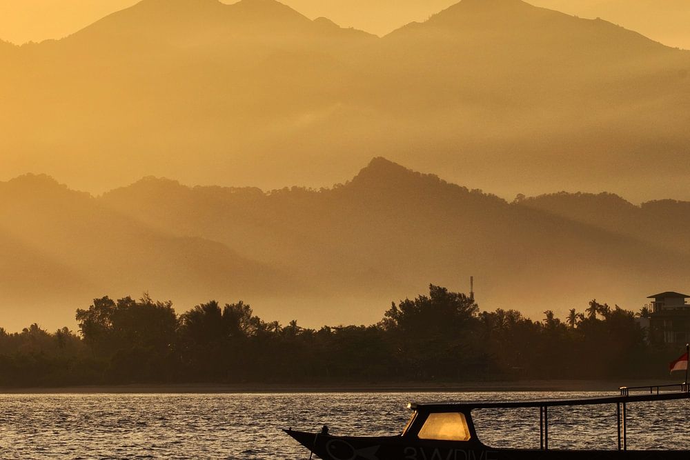 Vue de Lombok depuis l'île de Gili Air, tôt le matin.