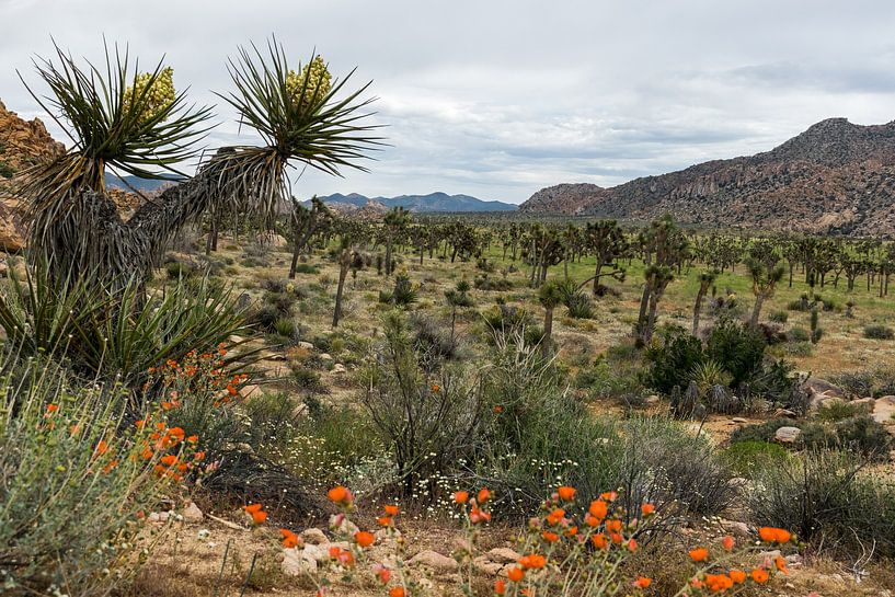 Sur cette photo, vous voyez une belle vue du parc national de Joshua Tree en Amérique. Vous pouvez voir les montagnes, les rochers et bien sûr les arbres de Josué eux-mêmes.