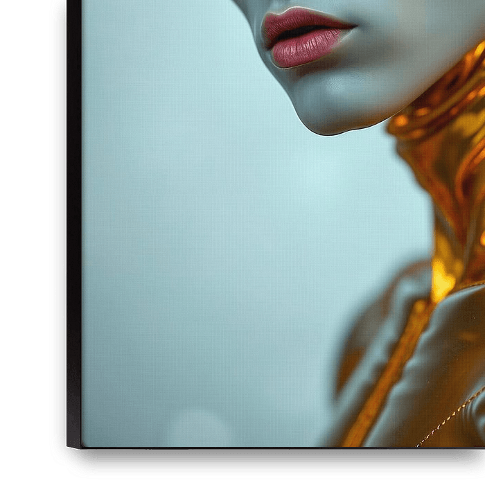 Un portrait rapproché aux tons de peau froids, presque vitreux, associé à un col doré très brillant. Un fin ornement doré d'inspiration baroque recouvre la zone des yeux et ressemble davantage à un bijou technique qu'à une décoration. Au deuxième coup d'œil, on remarque les petits détails : le reflet très contrôlé sur les pommettes, le tracé discret des sourcils, le fond mat qui contrebalance la brillance du métal et la tension précise entre la peau douce et la surface dure.