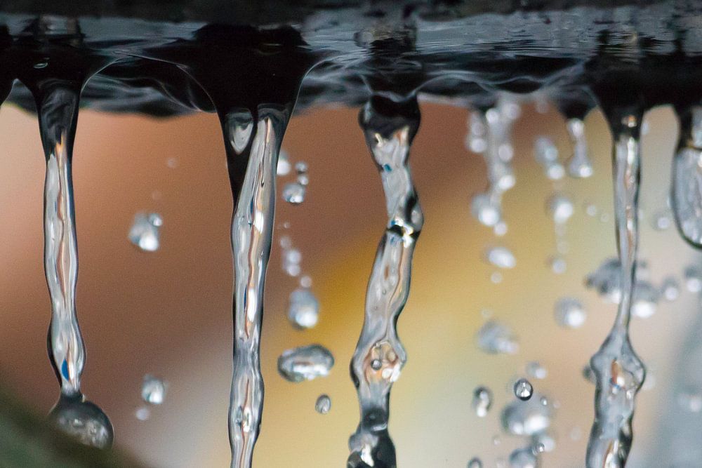 Smeltwater, detailopname van waterdruppels in regenpijp
