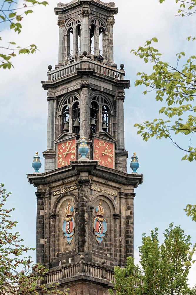 Dominant fièrement tous les bâtiments, la Westerkerk se dresse à la limite du quartier Jordaan d'Amsterdam. Vous voyez la couronne au sommet de la tour ? Elle contraste magnifiquement avec le ciel bleu. C'est le printemps, les feuilles viennent de tomber sur les arbres, et cela donne à la scène quelque chose d'aérien.