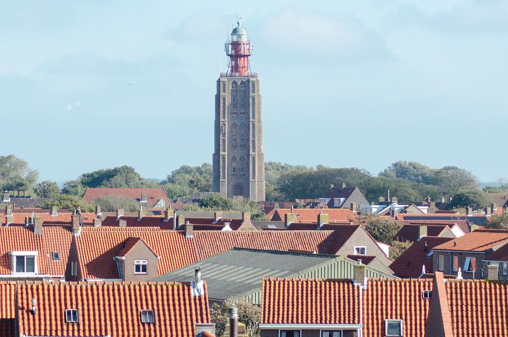 Uitzicht over de daken van Westkapelle naar de vuurtoren aan de horizon