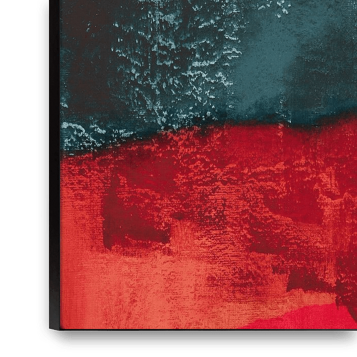 Les tons de terre se mélangent en couches horizontales avec des nuances de beige, de blanc, de vieux rose, de vert bleu foncé froid et de rouge chaud, parfois ardent, pour former un paysage structuré et abstrait. Les couches évoquent des éléments naturels comme le sable, l'eau, la neige, le magma et peut-être une rive de lac ou une vallée bordée d'arbres.