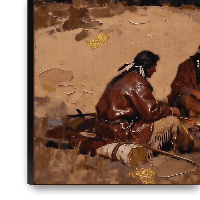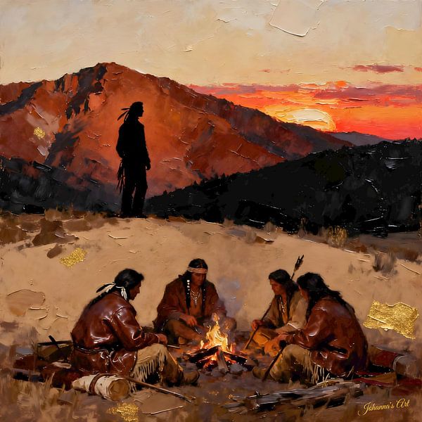 Sous un coucher de soleil vibrant et déclinant, quatre Amérindiens se rassemblent tranquillement autour d'un feu de camp rougeoyant, dont la chaude lumière scintille dans le vaste ciel du soir. Non loin de là, une silhouette solitaire se tient sur une élévation douce, se détachant sur des bandes d'ambre, de cramoisi et d'indigo,…