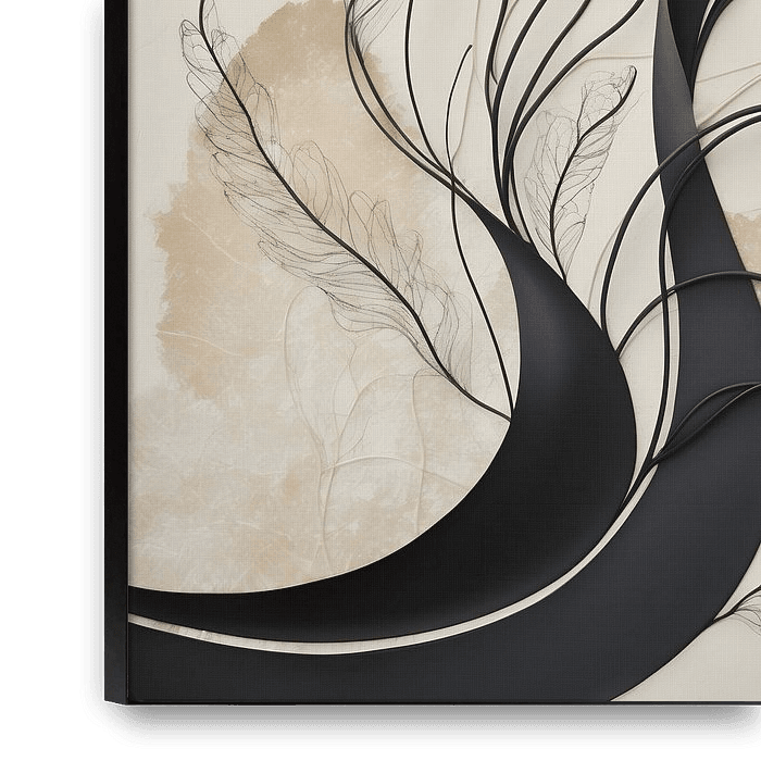 Whispers of Motion est une œuvre d'art abstraite verticale hypnotique qui capture l'essence du mouvement et de l'élégance. Des lignes subtiles et chuchotantes en noir mat et gris fumée se balancent et dansent sur un fond crème légèrement altéré, comme d'élégantes branches stylisées et des vrilles tourbillonnantes. La composition évoque…