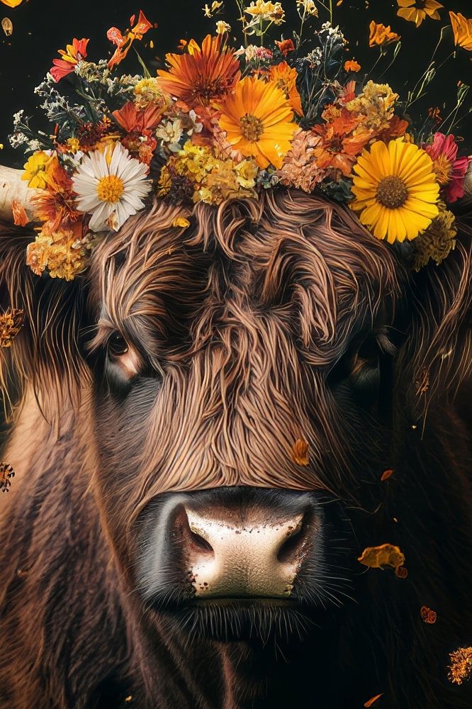 Cette image impressionnante montre un majestueux highlander coiffé d'une délicate couronne florale composée de fleurs jaune vif, orange et blanches, symbole de splendeur naturelle et d'élégance. Le contraste entre la structure robuste du taureau et les pétales aériens tourbillonnant dans l'air crée un équilibre harmonieux entre force et beauté. Le fond sombre met en valeur l'éclat des fleurs et la texture douce de la fourrure. Idéale pour les amoureux de la nature, cette œuvre d'art ajoute une touche rustique et sophistiquée à tout intérieur.