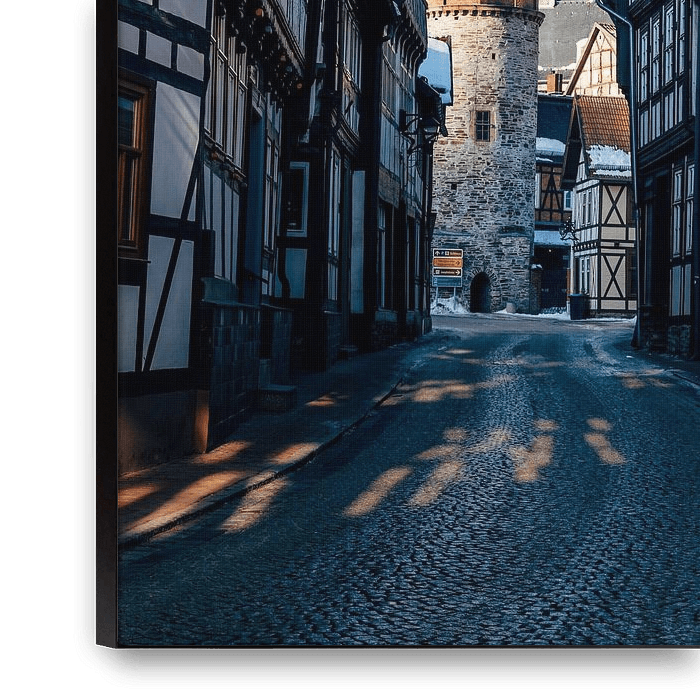 Cette photo montre une rue étroite dans le centre historique de Stolberg, bordée de part et d'autre de maisons à colombages caractéristiques. Les bâtiments forment un mur de rue fermé qui attire naturellement le regard vers la tour au bout de la rue. Cette tour constitue le centre évident de la composition et donne à l'image direction…