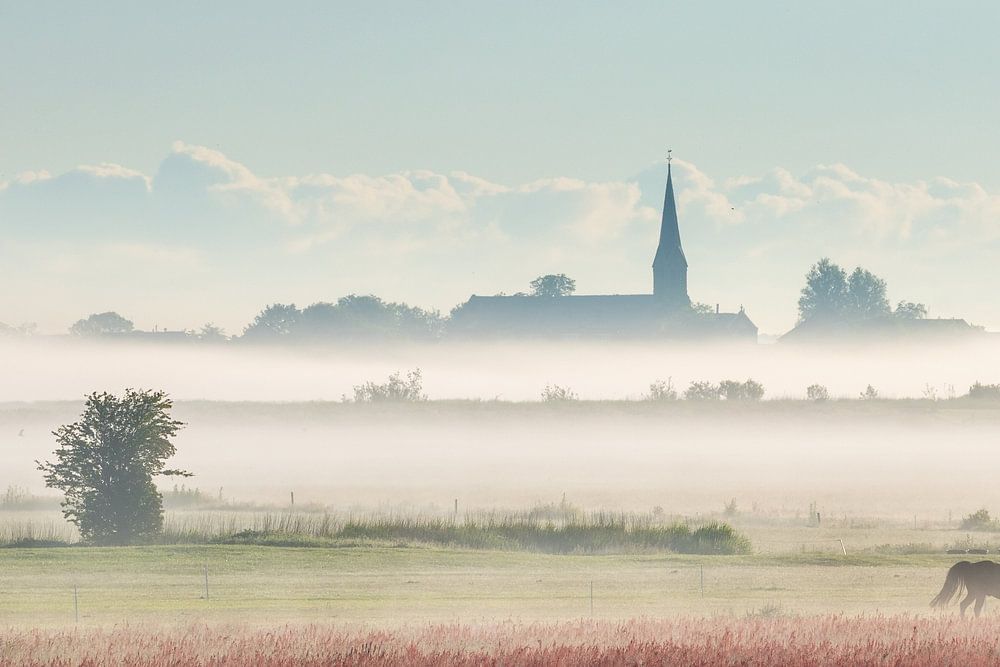 La brume se dissipe rapidement alors que le lever du soleil diffuse déjà sa chaleur à Wormer. Le cheval est à la recherche d'herbe fraîche et rassise. L'église catholique romaine Mary Magdalene est clairement visible et domine la brume. La prairie est pleine de belles couleurs.