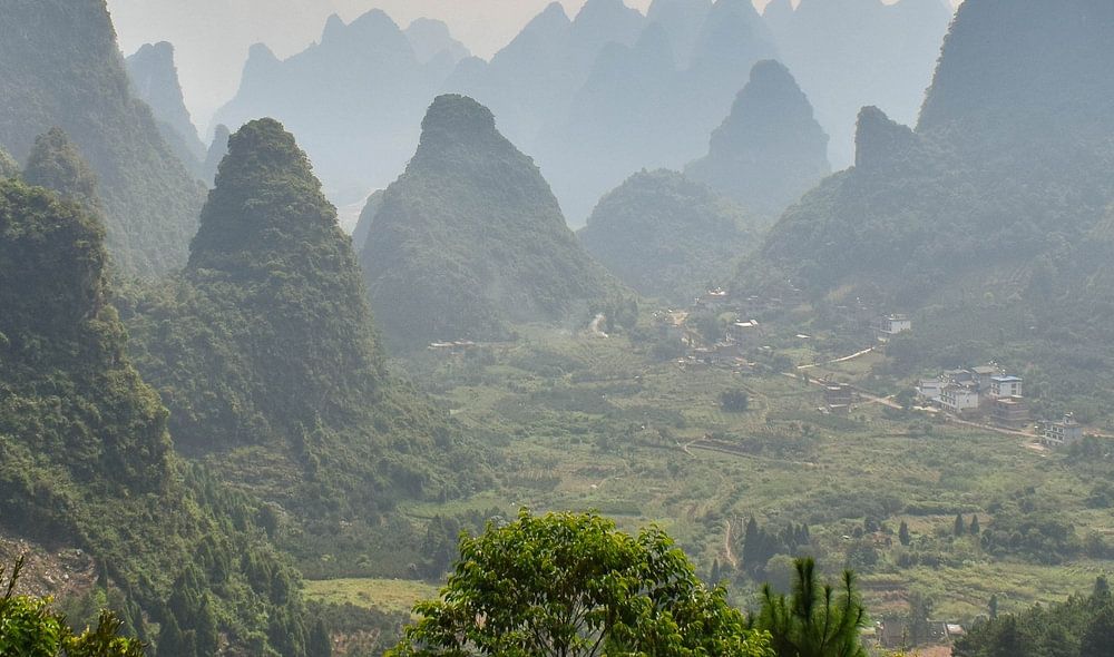 Paysage karstique avec des pics montagneux pointus près de Yangshuo, dans le sud de la Chine.