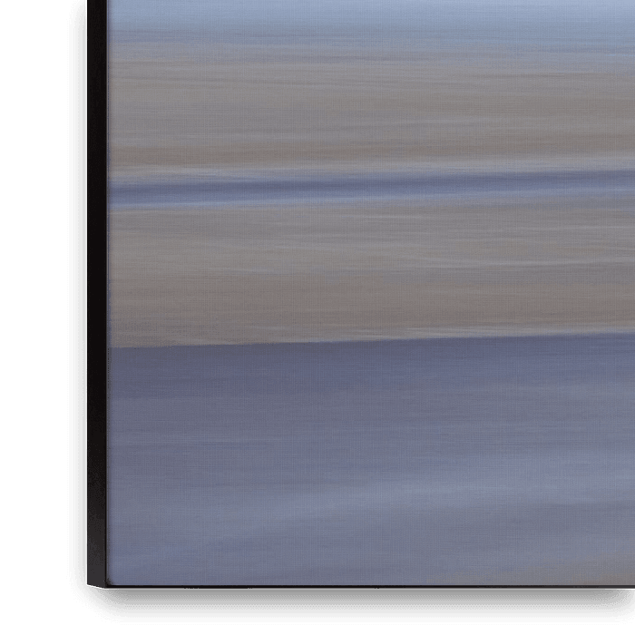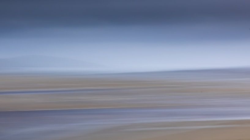 Une vue marine apaisante où l'eau et l'horizon se fondent doucement l'un dans l'autre. La longue vitesse d'obturation crée un flou pictural qui dégage une impression de calme et d'espace. Les transitions subtiles entre le bleu, le sable et le gris confèrent à cette image un aspect minimaliste et intemporel.