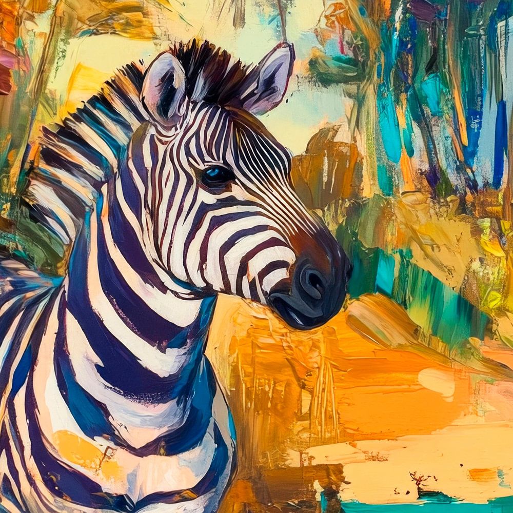 Dans un jeu vif de couleurs et de formes, une majestueuse figure de zèbre se détache, entourée de palmiers luxuriants et d'eau scintillante. Les traits vifs et contrastés confèrent à la scène dynamisme et vie, tandis que l'association harmonieuse de la nature et de la force animale transporte le spectateur dans un monde lointain et exotique.