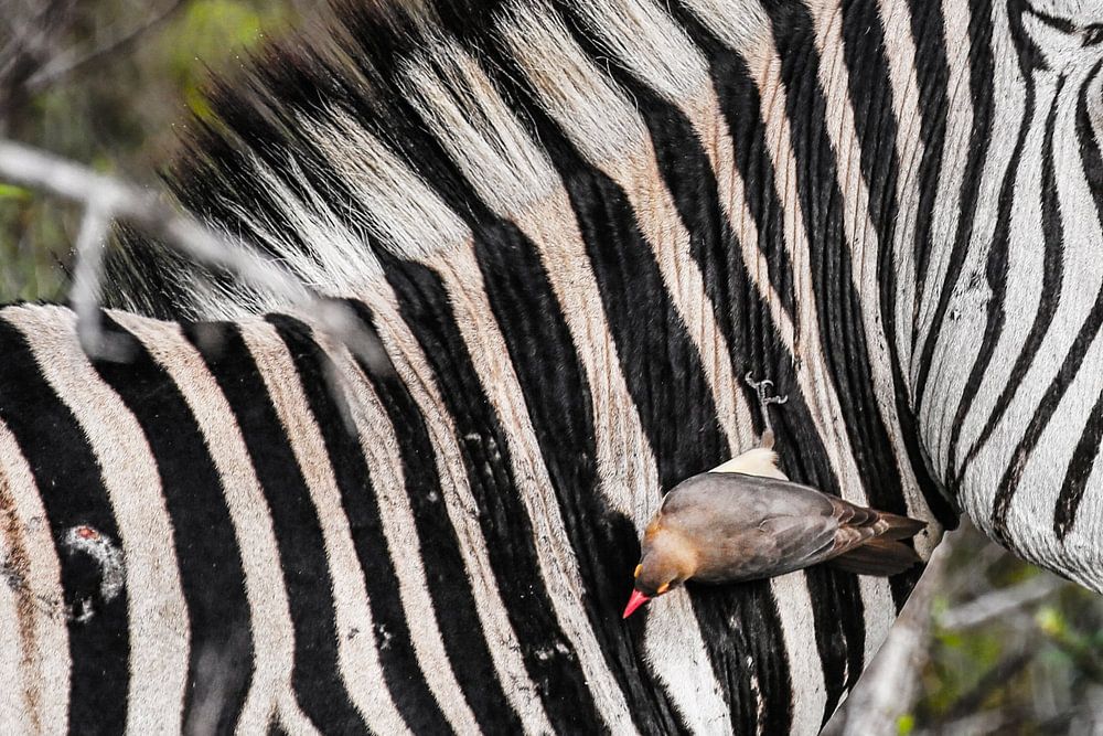 Dans la sereine savane africaine, un zèbre se tient gracieusement au milieu des hautes herbes. Perché sur son dos, un petit oiseau, probablement un pic-vert, picore doucement le pelage du zèbre, une relation symbiotique courante dans la nature. Le zèbre reste immobile, ses oreilles s'agitant de temps à autre, tandis que l'oiseau poursuit son travail. La scène capture un moment de coexistence tranquille entre deux espèces différentes dans leur habitat naturel.