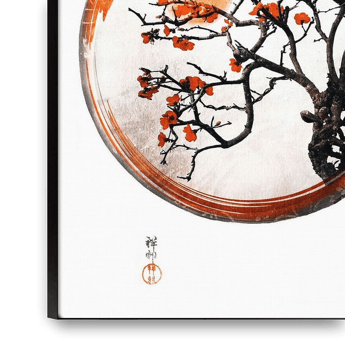 Bonsaï en cercle avec la lune dans les tons d'orange et avec une structure de papier vintage altérée par le temps. Zen, yin yang