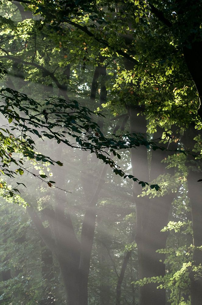 De zon schint door de bomen. De mist is nog niet helemaal opgetrokken. Ondanks de herfst zijn de bladeren nog groen.