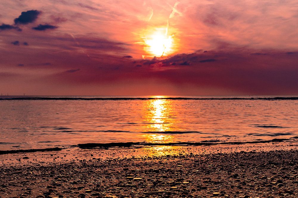 Een mooie zomeravond op het strand van Egmond aan Zee. Door de wolken filtert het licht tot prachtige kleuren.