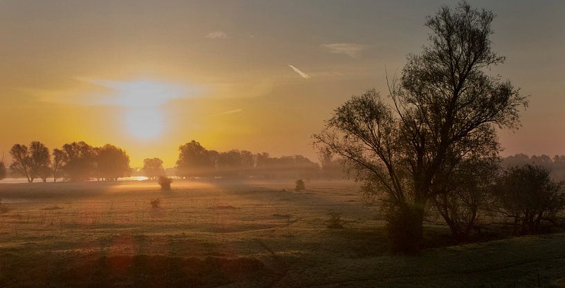 Beuningen 02-05-2016. Zonsopkomst over de uiterwaarden in Beuningen met op de achtergrond de rivier de Waal in licht mist gehuld. FOTO: GER LOEFFEN