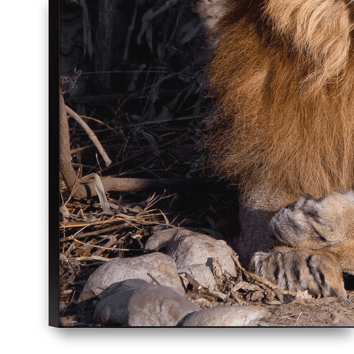 Achetez cette œuvre d'art de lions a l'air curieux. Un mâle lion puissant avec une crinière chic consacrée par le soleil. par Michael Semenov sur toile, aluminium, ArtFrame ou photographie (encadrée), impression d'art en haute qualité et tout format.