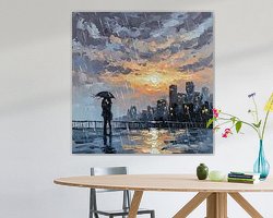 Il s'agit d'une peinture impressionniste, probablement à l'huile sur toile, représentant une scène romantique de coucher de soleil dans une ville pendant une averse. Des traces de pluie sont visibles sur l'ensemble de la toile, ajoutant une atmosphère dynamique et quelque peu mélancolique.