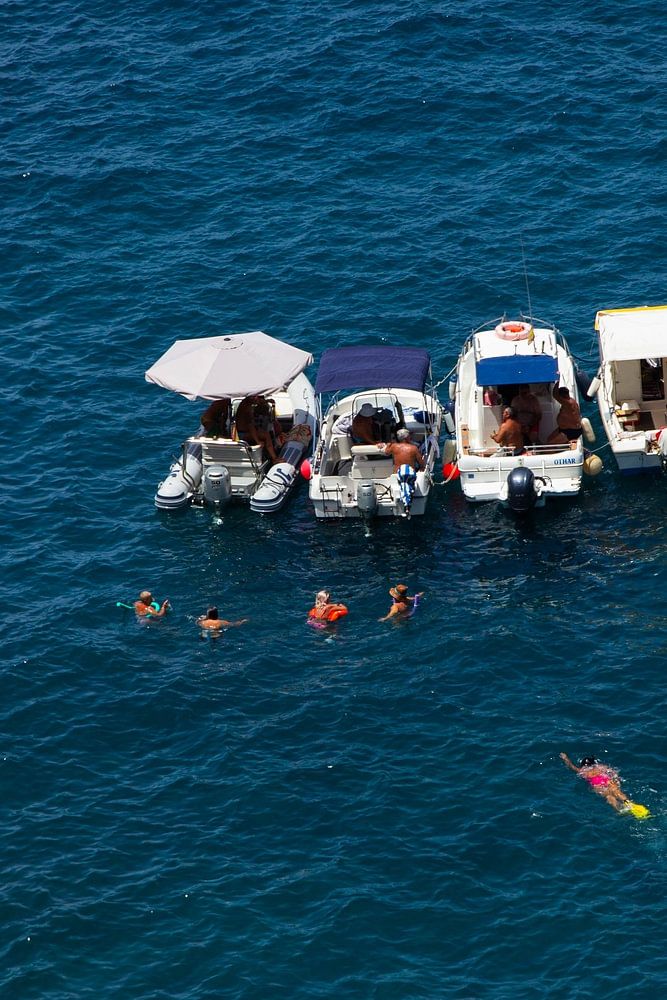 Cette photo montre quatre bateaux proches les uns des autres, tandis que les personnes dans l'eau s'amusent ensemble. C'est l'un de ces moments où l'on sent que la vie n'est qu'une question de connexion et d'appréciation du moment présent. Malgré l'agitation de la vie quotidienne, on peut vraiment se détendre ici et être simplement soi-même avec les autres. L'eau est si profonde et si bleue, et il semble que tout soit parfait à ce moment-là.