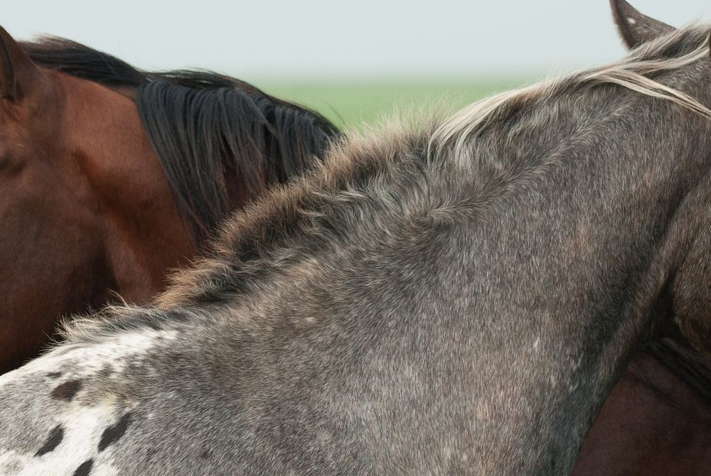 deux chevaux se tripotant l'un l'autre après être restés à l'écurie pendant six mois. Cela s'est passé à la campagne, dans le nord de la Frise.