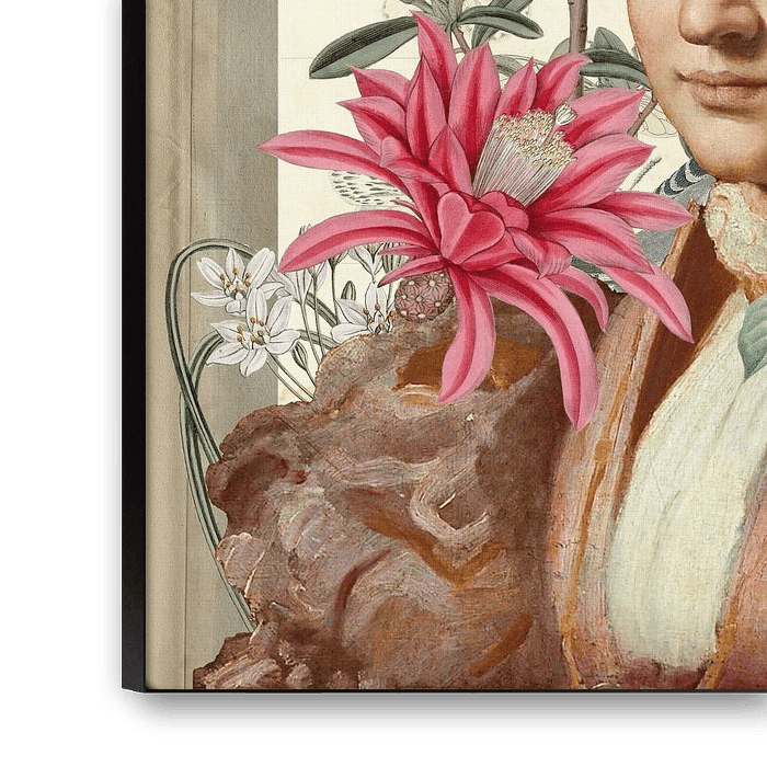 Cette œuvre d'art combine un portrait de femme avec divers éléments tels que des images botaniques de fleurs, des plantes et un lézard.