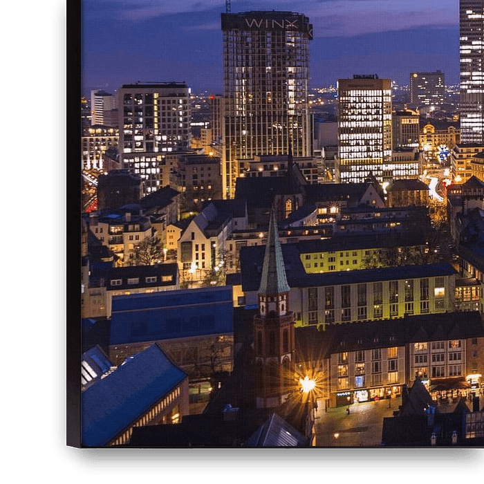 Francfort de nuit et à l'heure bleue, la ligne d'horizon magnifiquement illuminée est quelque chose de spécial en Europe. La vue sur la ville et les rues illuminées. La vue sur la ville est tout simplement magnifique.