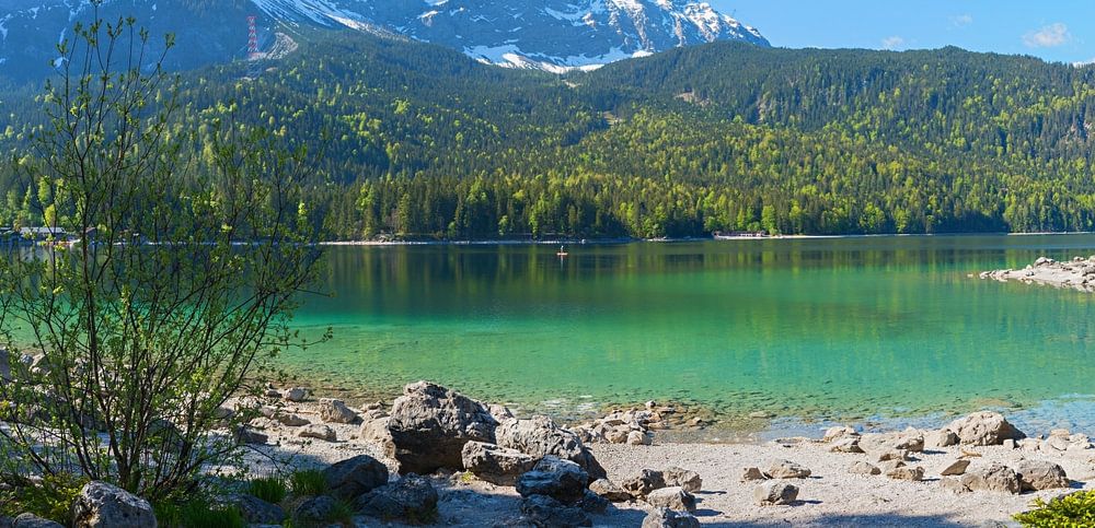 beau lac Eibsee, avec vue sur la montagne Zugspitze, paysage de printemps bavarois supérieur