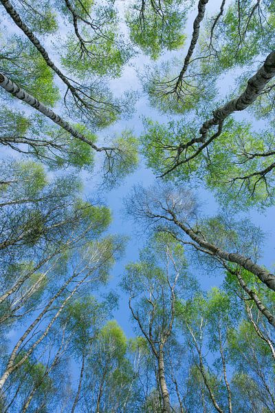 Des troncs de bouleau s'élèvent verticalement vers le ciel, tandis que des feuilles tendres et fraîches forment une canopée lâche sur fond de ciel bleu. La perspective est orientée de bas en haut, de sorte que les cimes des arbres forment un cadre circulaire autour du centre de l'image.