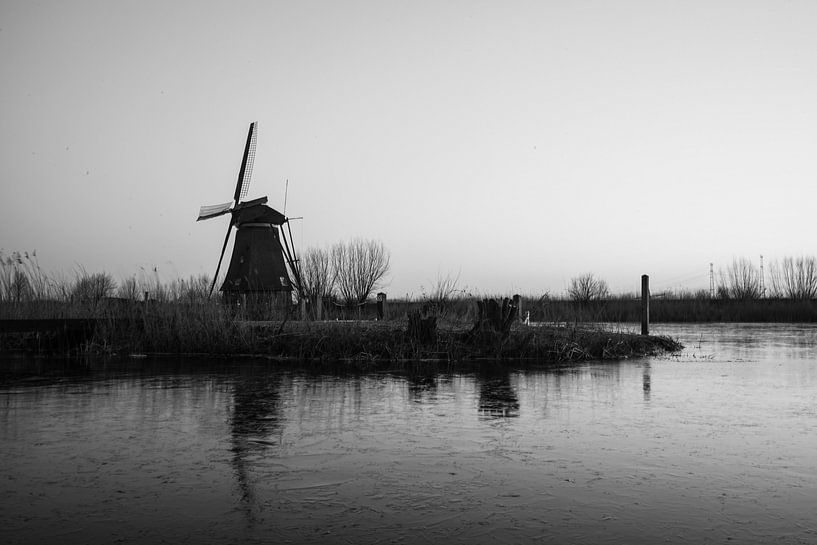 zwart/wit foto, van een Kinderdijk molen, die langs het water staat