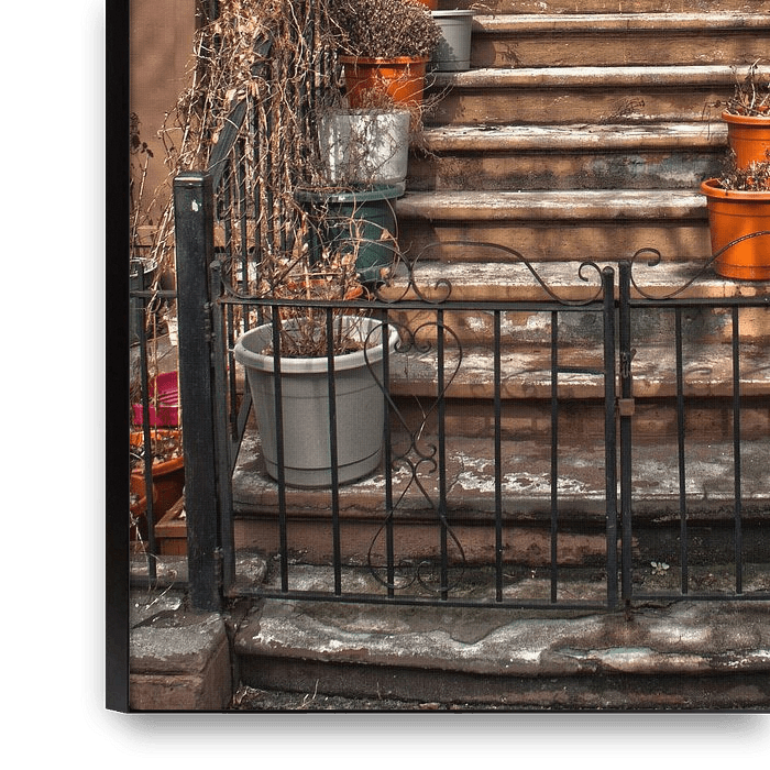 Leuke straatjes in Harlem New York met oude trappetjes die vol staan met potjes bloemen. "als je ze water geeft"