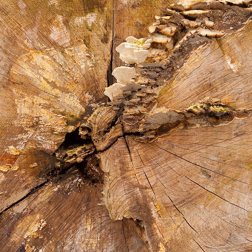 Afgezaagde boomstam met zicht op de jaarringen en de grillige patronen in het hout. Het zaagvlak is begroeid met paddenstoelen, schimmels en zwammen.
