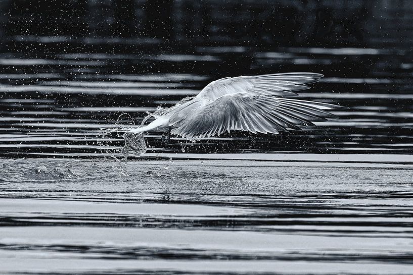 La hirondelle de mer, dans son vol gracieux, plonge depuis une faible hauteur dans la mer pour attraper des poissons. C'est tellement beau à voir, car elle plonge complètement sous l'eau pour attraper le poisson.