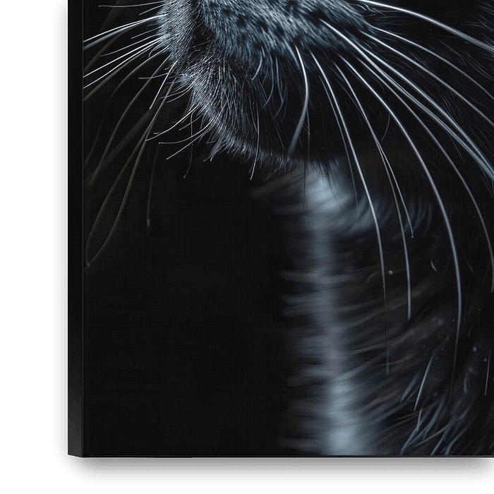 Un chat noir sur une toile noire semble flotter comme une silhouette dans l'obscurité. Sa fourrure brillante capte à peine la lumière, ce qui rend son contour vaguement discernable. Ses yeux, tels des pierres précieuses étincelantes, sont la seule source de contraste sur la toile sombre. Le chat dégage une aura de mystère et d'élégance,…