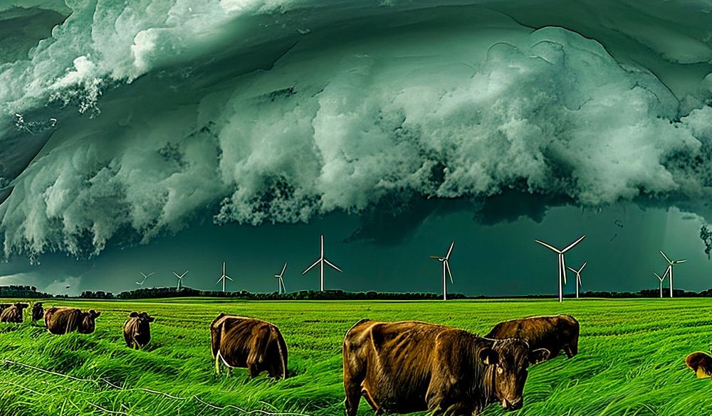 nuages d'orage sur une prairie avec des vaches et des moulins à vent dans le paysage des polders néerlandais